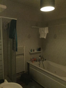 La pièce d'eau été repensée, la baignoire est remplacée par une douche design à bac plat, une alcove a été créée dans le mur afin de permettre au propriétaire d'y poser ses produits de douche. L'éclairage dans l'alcove réalisé grâce à un bandeau leds étanche donne une pointe de lumière au fond de cette pièce. Les appareils et meubles de la salle de bain ont tous été remplacés par des éléments plus élégants, modernes et fonctionnels.